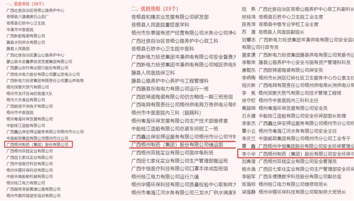 梧州市“安康杯”競賽活動由梧州市總工會發(fā)起組織,目的是通過競賽不斷推進企事業(yè)單位的安全生產(chǎn)工作和安全文化建設(shè),不斷擴大社會影響,提高全民安全生產(chǎn)意識,最終降低各類事故的發(fā)生率和各類職業(yè)病的發(fā)病率,是企業(yè)強化安全生產(chǎn)工作的重要載體和活動形式。梧州制藥通過發(fā)動廣大職工群眾共同參與競賽,有效促進基層班組落實安全生產(chǎn)的各項規(guī)章制度,進一步推動公司的安全建設(shè)工作。