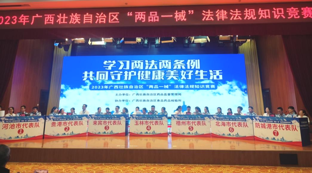 7月13日,由梧州制藥員工代表——質(zhì)量控制部呂金慧、質(zhì)量保證部李佳霖與梧州市場監(jiān)督管理局監(jiān)管人員組成的梧州市代表隊參加廣西壯族自治區(qū)“兩品一械”法律法規(guī)知識競賽,憑借過硬的專業(yè)知識、迅速的反應(yīng)能力、高效的團隊配合力,與全區(qū)14個市代表隊展開激烈角逐,榮獲得2023年廣西壯族自治區(qū)“兩品一械”法律法規(guī)知識競賽一等獎。