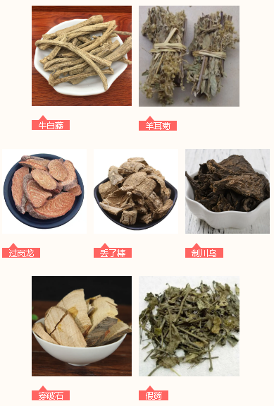 臣藥:牛白藤、羊耳菊、過崗龍、丟了棒、假蒟、穿破石、制川烏