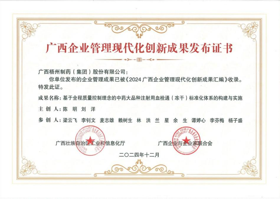科技賦能,中藥煥新丨梧州制藥成果入選廣西企業(yè)管理現(xiàn)代化創(chuàng)新成果匯編名錄