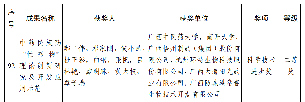 7月4日,2024年度廣西科學(xué)技術(shù)進(jìn)步獎獲獎名單正式公布,廣西梧州制藥(集團(tuán))股份有限公司參與的《中藥民族藥“性-效-物”理論創(chuàng)新研究及開發(fā)應(yīng)用示范》項目榮獲廣西科學(xué)技術(shù)進(jìn)步獎二等獎。獲獎項目由大學(xué)院校和企業(yè)聯(lián)合完成,旨在通過創(chuàng)新的理論研究,揭示中藥和民族藥的藥效物質(zhì)基礎(chǔ),提升傳統(tǒng)藥物的現(xiàn)代化水平,梧州制藥作為該項目的第三完成單位,彰顯了其在中藥現(xiàn)代化研究領(lǐng)域的實力。
